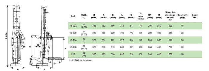 Merk Brano Type Dommekracht Werklast 2500 kg t/m 20.000 kg Dommekracht in een robuste uitvoering. Mechanische vijzel Werklast op de kop 100% van de WLL. Werklast op de teen 70% van de WLL. Tandwielen en rondsels in matrijs gesmeed. Lage drijfstangdruk door de grote overbrengingsverhouding. Met vaste tandheugel en heffend huis. Levertijd op aanvraag.