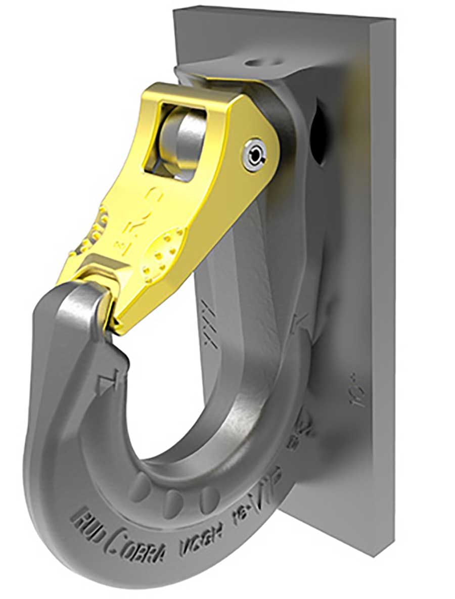 Aanbouwhaken als vastzetpunt aan traversen voor staaldraden, rondstroppen en ogen of ovale ringen.